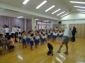 可愛いバスが見えると「にっこりキャラバンきた~」と大喜びの子どもたち。ワクワクしながら「なかよしひろば(ホール)」に2~5歳児が集まり、生活に関する「映画紙芝居」を見たり、ダンスや運動遊びを教えてもらいましたよ。来ていただいた先生方がとっても面白く、笑顔の絶えない楽しい時間でした。「にっこりキッズキャラバン」の皆様、ありがとうございました。